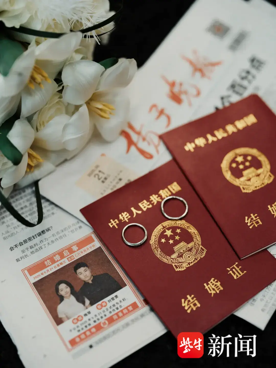 新娘透露,他们和扬子晚报非常有缘分,就在今年5月21日,梅琴和刘雪霁还选择在扬子晚报上刊登了结婚启事,纪念这一人生中的重要时刻。“我们很喜欢用传统媒体记录人生重要日子的方式,这样可以永远保存下来,方便以后都可以看,这种感觉真好。”