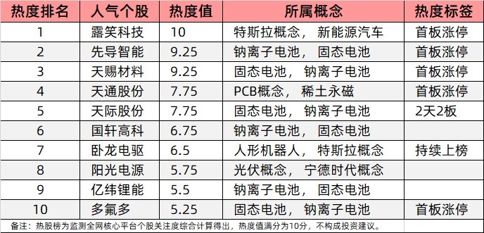 今日,A股十大人气热股如下:露笑科技、先导智能、天赐材料、天通股份、天际股份、国轩高科、卧龙电驱、阳光电源、亿纬锂能、多氟多。